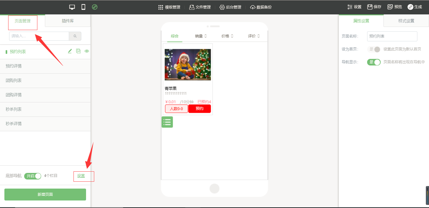 1.点击“后台管理”-“添加产品”-选择“团购”,然后添加产品信息,添加完成之后,点击“保存”,在小程序编辑器中拖入“团购列表”插件。点击选中该插件,在页面的右侧,有“属性设置”和“样式设置”,“属性设置”包括“排序设置”、“显示设置”等、“样式设置”包括“背景设置”、“边框设置”、“文字设置”、“图片设置”、“分割线设置”、“间距设置”,设置完毕后,点击保存,然后新建一个“团购详情”页面,拖入“...